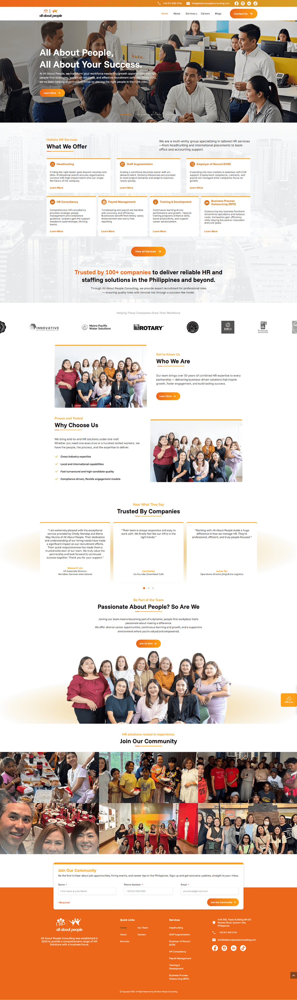 All About People Consulting is a Philippine human resource consulting company established in 2019. It provides comprehensive HR solutions including headhunting, staff augmentation, employer-of-record services, HR consultancy, training, payroll management and BPO services. With a team of industry-experienced consultants, it delivers results-driven, trustworthy HR partnerships across multiple sectors.