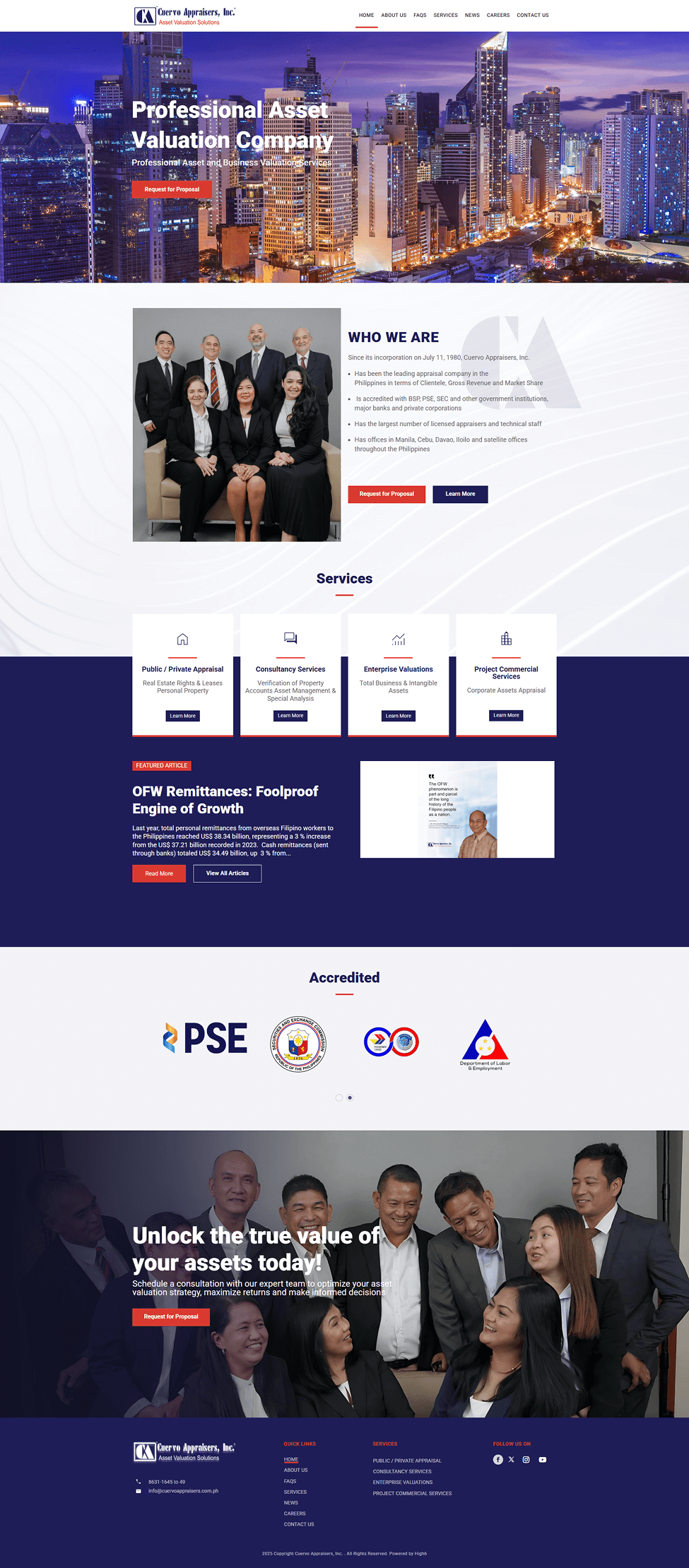 Cuervo Appraisers Inc., incorporated on July 11, 1980, is the Philippines’ leading property appraisal company. Accredited by the Bangko Sentral ng Pilipinas, Philippine Stock Exchange and Securities and Exchange Commission, it employs the largest number of licensed appraisers and has offices in Manila, Cebu, Davao and Iloilo. The company provides real estate, machinery, enterprise valuations and consultancy services.