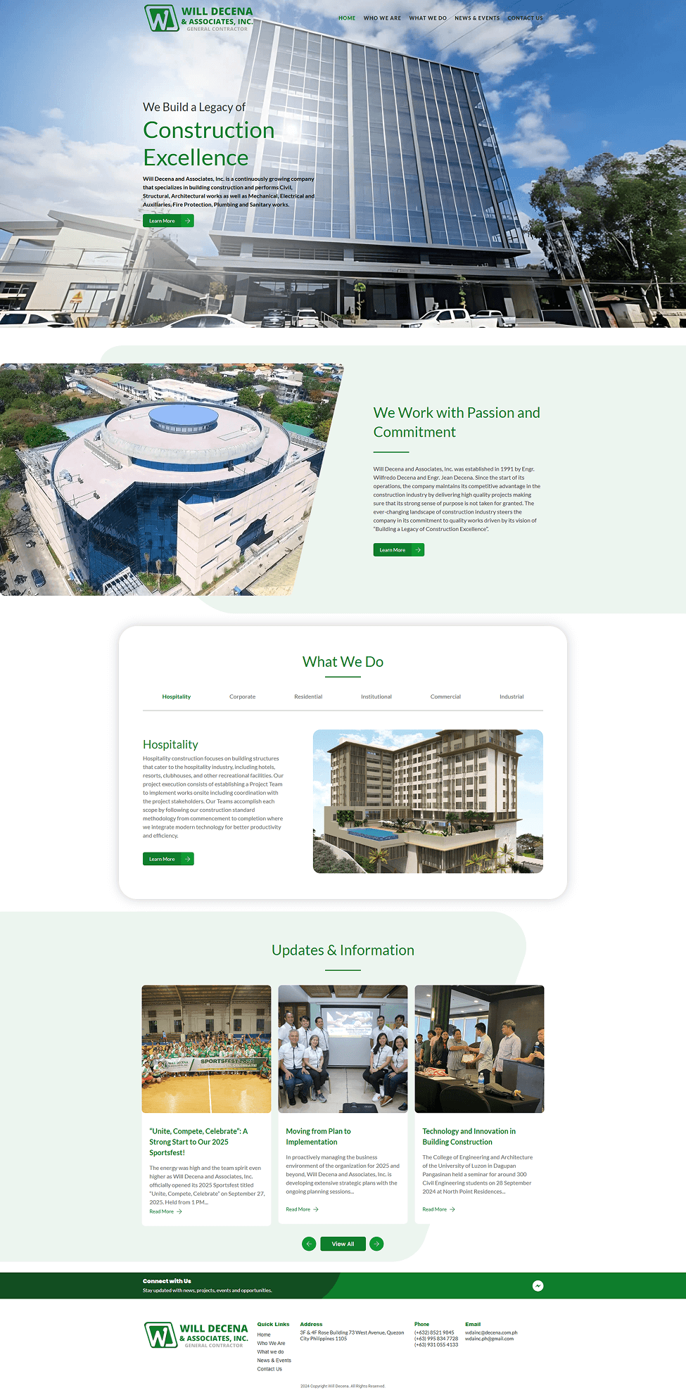 Will Decena and Associates, Inc., established in 1991 by Engr. Wilfredo and Engr. Jean Decena, is a construction company offering civil, architectural, mechanical, electrical and plumbing works. It builds hospitality, corporate, residential, institutional, commercial and industrial projects, maintaining a competitive edge by delivering high-quality projects and a vision of Building a Legacy of Construction Excellence.