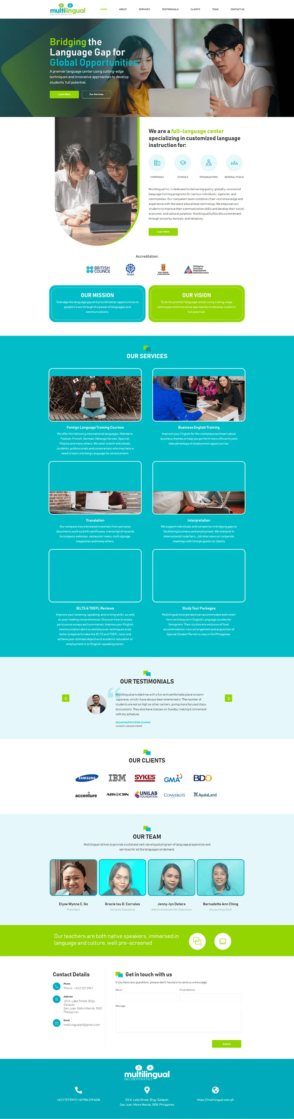 Multilingual Inc. is a premier language centre using cutting-edge techniques to develop students’ potential. The centre offers foreign language courses, business English training, translation, interpretation, IELTS/TOEFL reviews and study tours. It aims to bridge language gaps and provide opportunities for Filipinos and foreigners and envisions becoming the top language centre, nurturing cultural understanding.