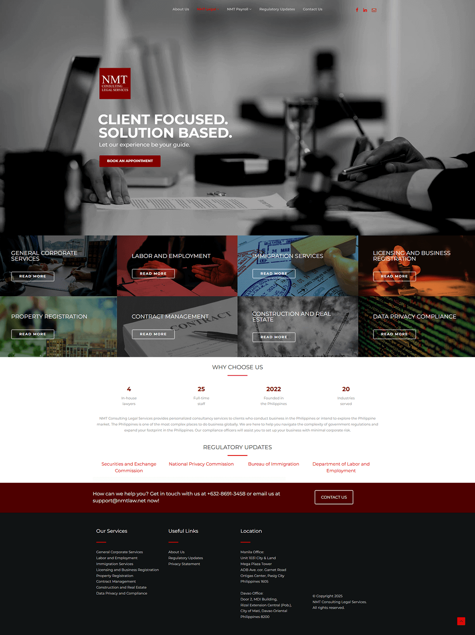 NMT Consulting Legal Services provides personalised corporate, labour, immigration, licensing, property, construction, real-estate, contract management and data‑privacy consultancy. Established in 2022, it has four in-house lawyers and 25 staff. The firm helps local and foreign businesses navigate complex Philippine regulations and set up operations, offering comprehensive compliance support and practical legal solutions.